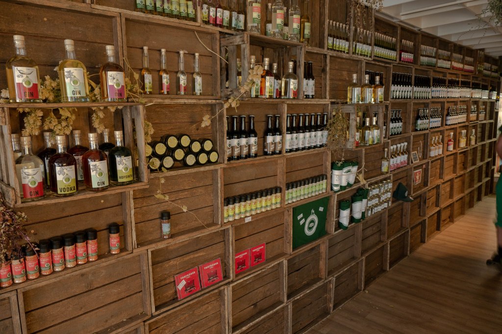 Darüber hinaus sind im Ladengeschäft eine Menge weiterer, nicht bieriger Produkte aus eigenem Anbau aufgereiht. Es ist gar nicht so leicht, sich hier einen schnellen Überblick zu erarbeiten. Neben den Marmeladen und Tees stolpern wir unter anderem über eine Reihe von ebenfalls sehr vielfältigen Spirituosen.