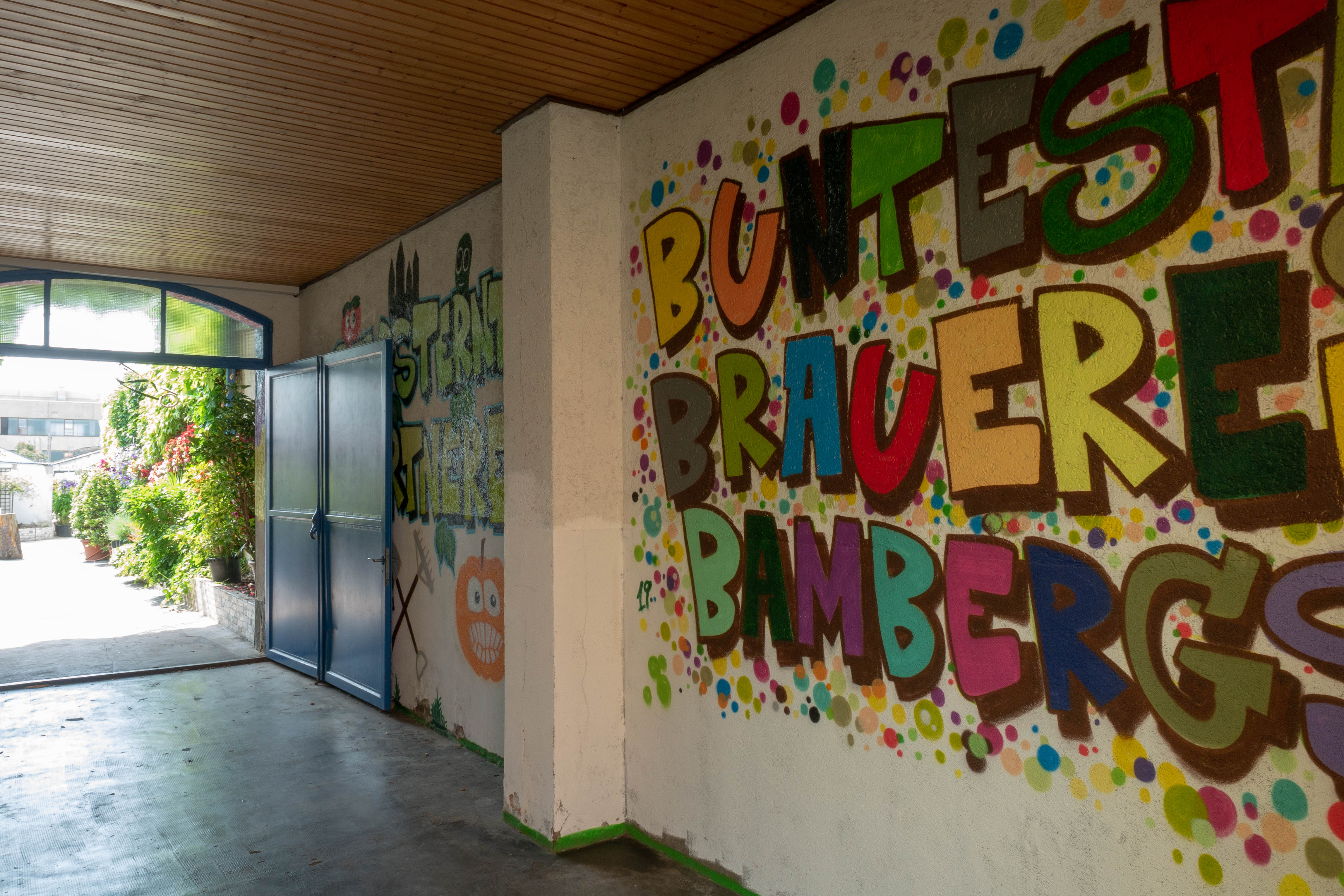 Eine zunächst unscheinbare Schaufensterfassade in einer unscheinbaren Straße mit schmuckloser Bebauung im Südwesten der Bamberger Gartenstadt, nördlich des Hauptbahnhofs. Allein die Graffiti mit lustigen Figuren in Form von Obst und Hopfendolden, die das Schaufenster rahmen, lassen erahnen, dass sich hinter dem eisernen Tor nicht einfach irgendein Hinterhof befindet. In der Durchfahrt dann ein weiteres Graffito: „Bunteste Brauerei Bambergs“.