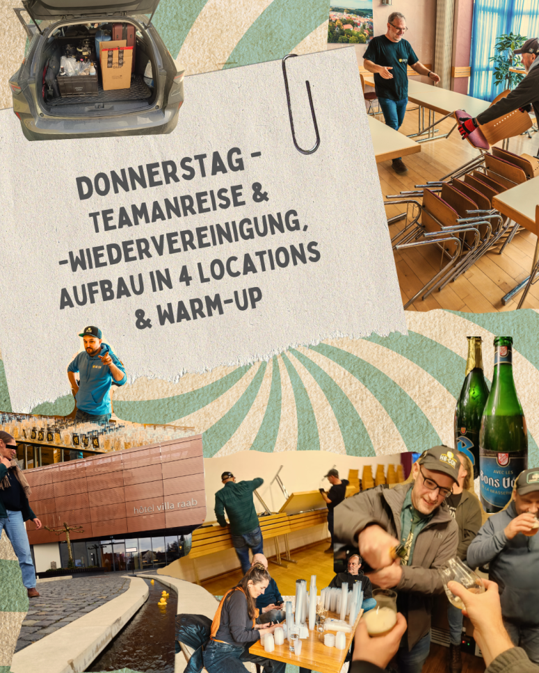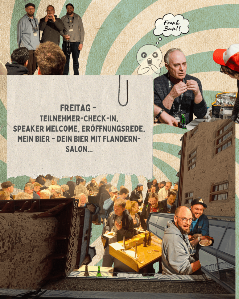 Der Freitag ist Teilnehmer-Anreisetag mit letzten Erledigungen und Vorbereitungen vor dem Check-in ab 14 Uhr. Für mich dieses mal besonders hektisch waren die 3 Begrüßungen hintereinander: zunächst die der 29 internationalen Speaker*innen, dann die große Begrüßung mit Daniel Stenglein aka ungespundet auf der Zeltbühne und dann mit Jan Brücklmeier und Florian Erdel aka Chaos Homebrewing/brautag!-Podcast im Salon unserer Gastregion Flandern & Milk the Funk.